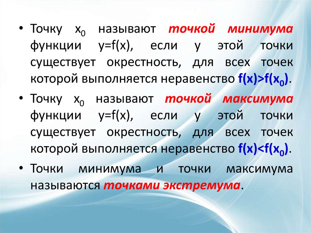 • Точку x0 называют точкой минимумафункции y=f(x), если у этой точки