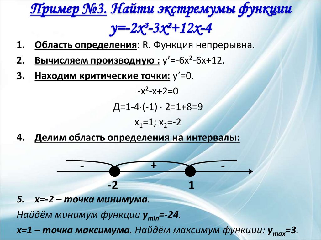 Пример №3. Найти экстремумы функцииy=-2x³-3x²+12x-4
