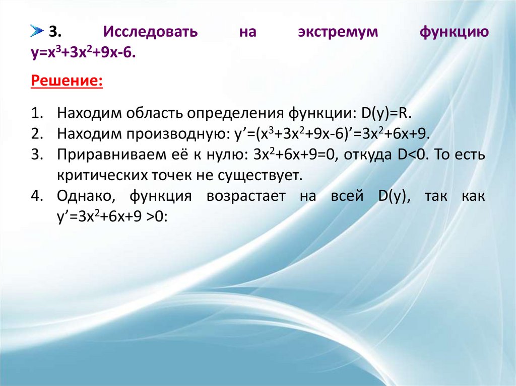 2. Находим производную: y’=(x3+3x2+9x-6)’=3x2+6x+9.