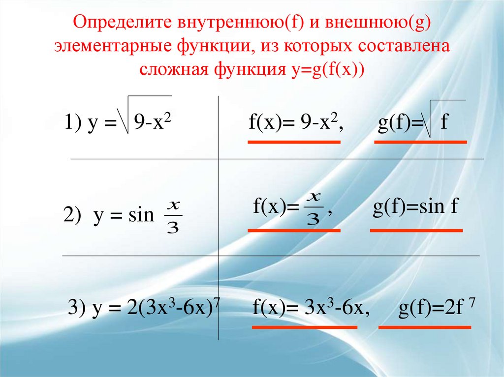 f(x) – «внутренняя функция»g(f) – «внешняя функция»
