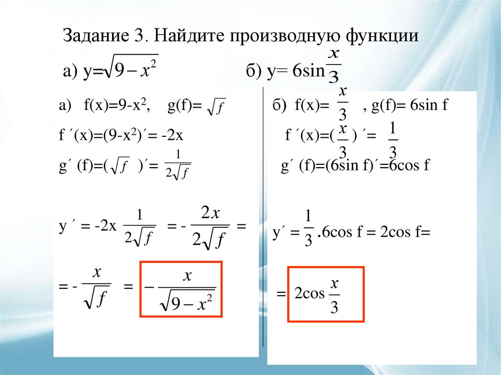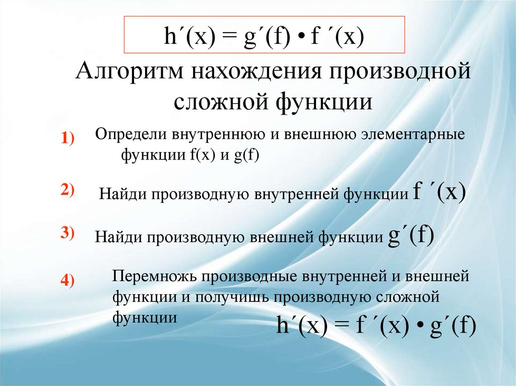 h΄(x) = g´(f) • f ´(x)Алгоритм нахождения производной