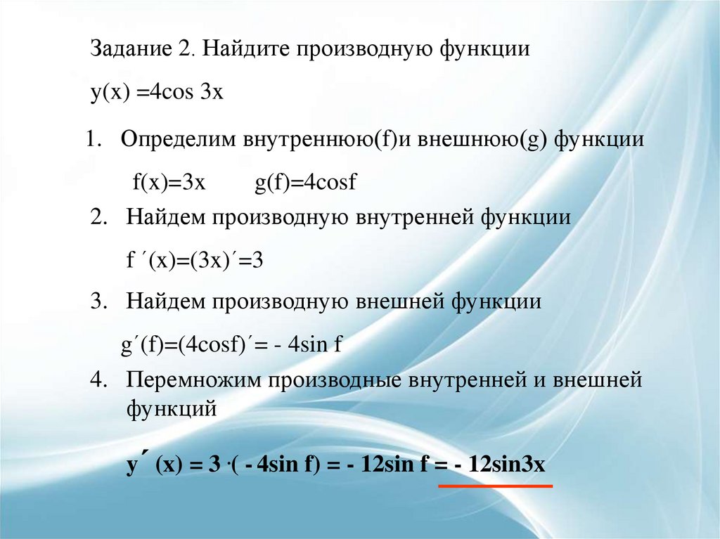 Задание 2. Найдите производную функцииy(x) =4cos 3x