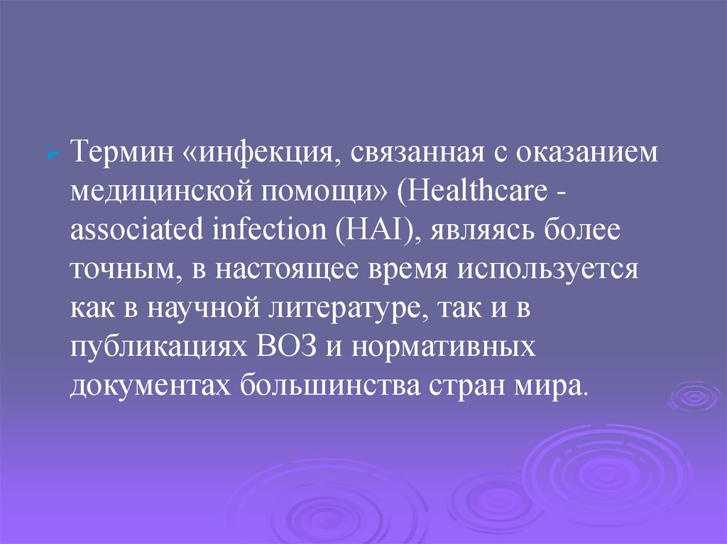 Термин «инфекция, связанная с оказаниеммедицинской помощи» (Healthcare associated infection (HAI), являясь более