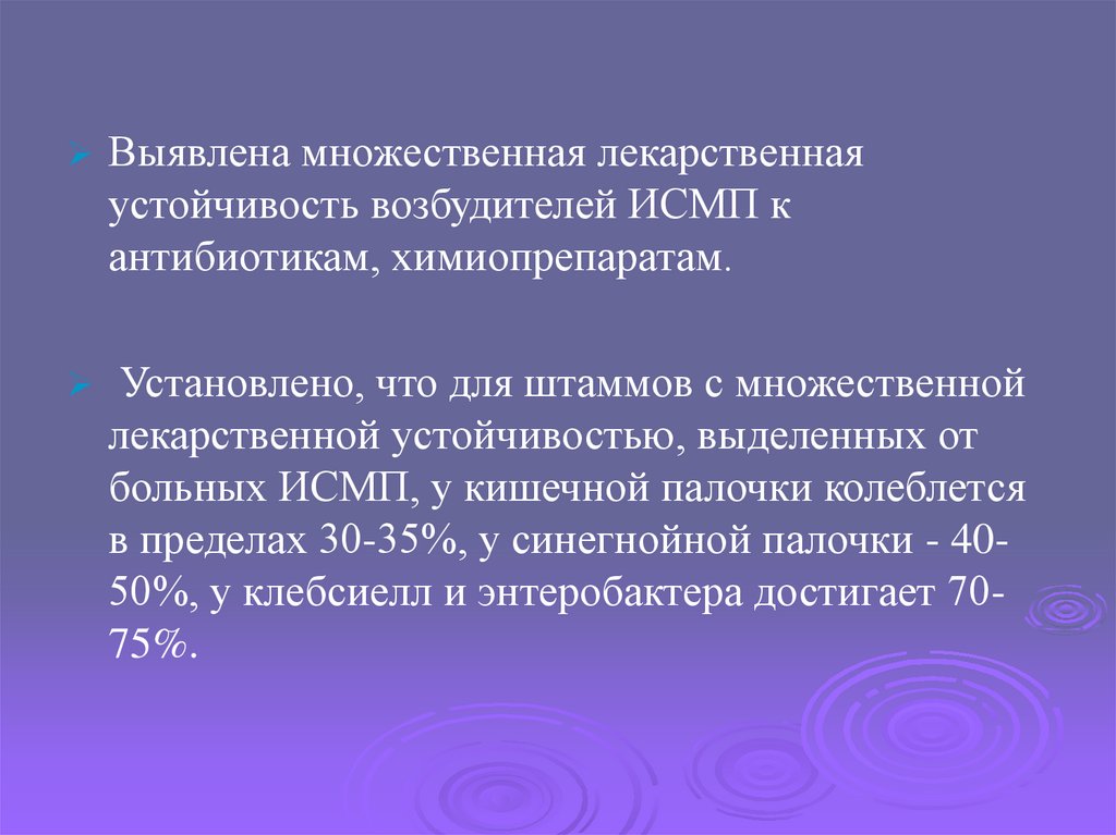 в пределах 30-35%, у синегнойной палочки - 4050%, у клебсиелл и энтеробактера достигает 7075%.