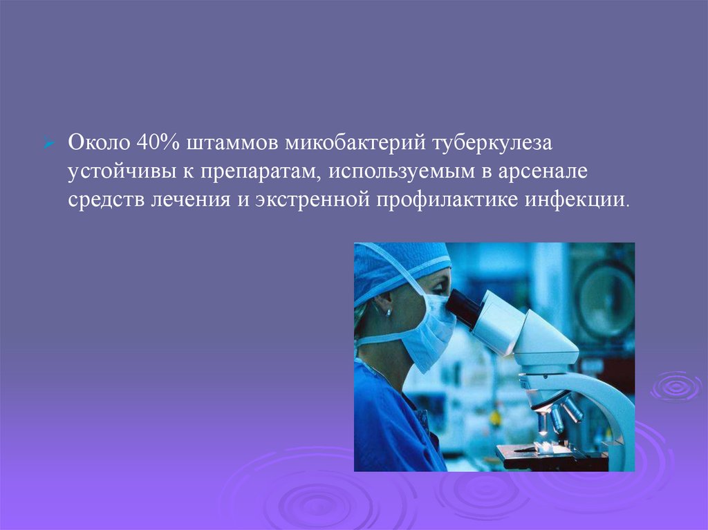 Около 40% штаммов микобактерий туберкулезаустойчивы к препаратам, используемым в арсенале