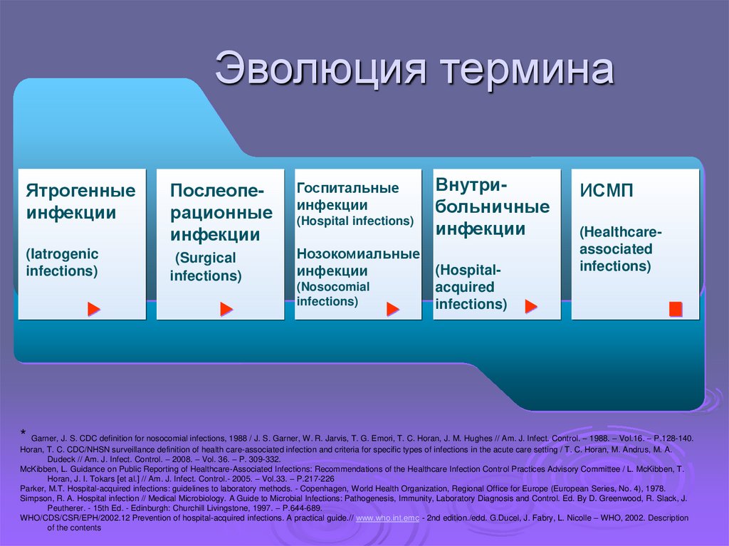 * Garner, J. S. CDC definition for nosocomial infections, 1988 / J. S. Garner, W. R. Jarvis, T. G. Emori, T. C. Horan, J. M. Hughes // Am. J. Infect. Control. – 1988. – Vol.16. – P.128-140.