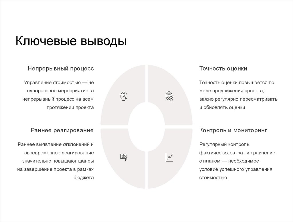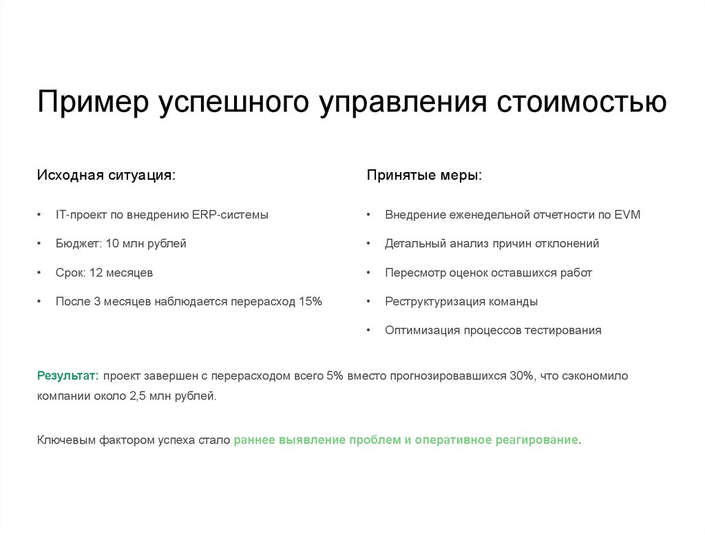Результат: проект завершен с перерасходом всего 5% вместо прогнозировавшихся 30%, что сэкономило