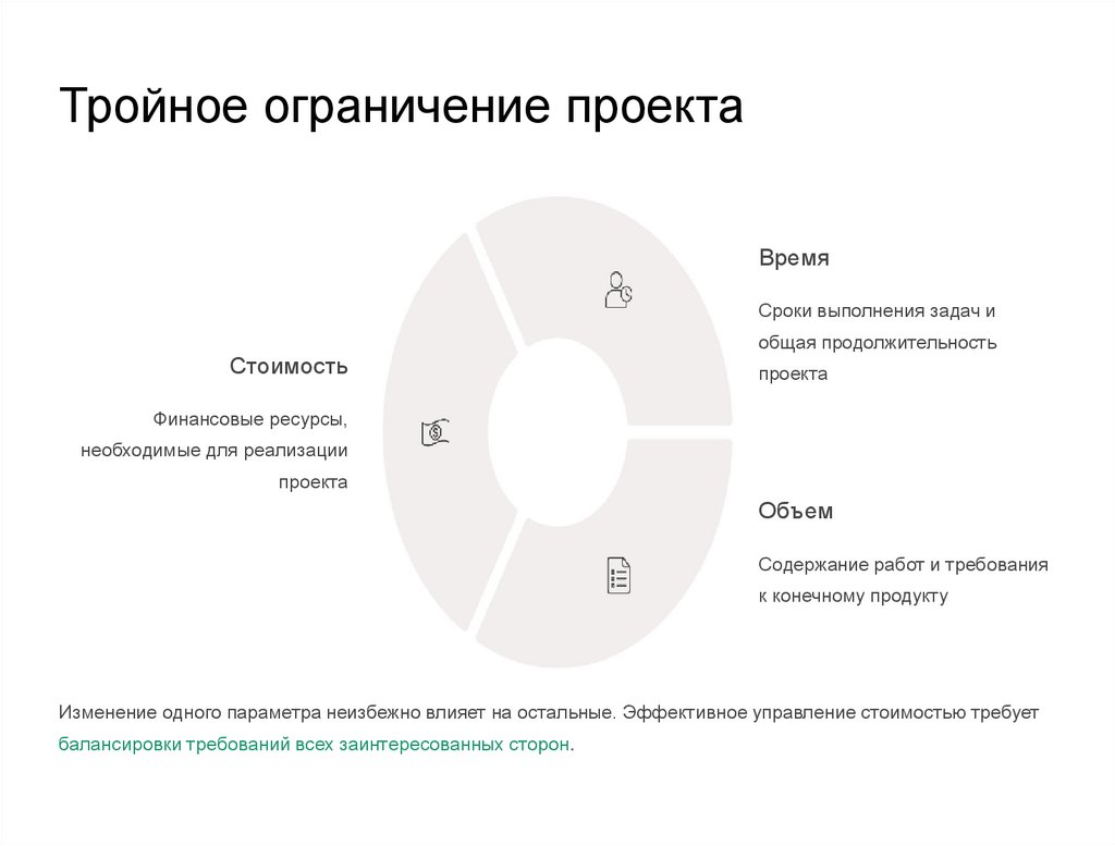 Тройное ограничение проекта визуализирует взаимосвязь междутремя ключевыми параметрами, которые необходимо