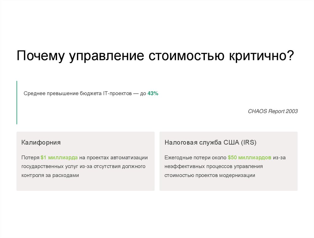 Почему управление стоимостью критично?Среднее превышение бюджета IT-проектов — до 43%