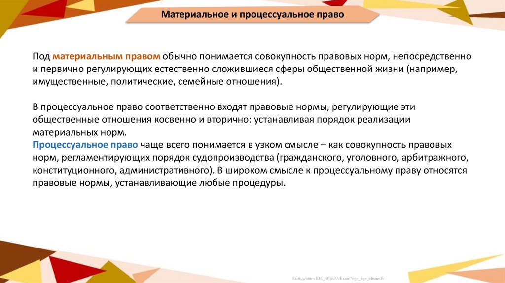 Материальное и процессуальное правоПод материальным правом обычно понимается совокупность правовых норм, непосредственно