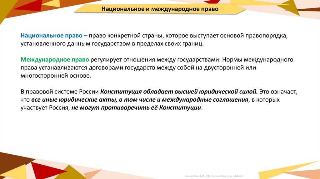 Национальное и международное правоНациональное право – право конкретной страны, которое выступает основой правопорядка,