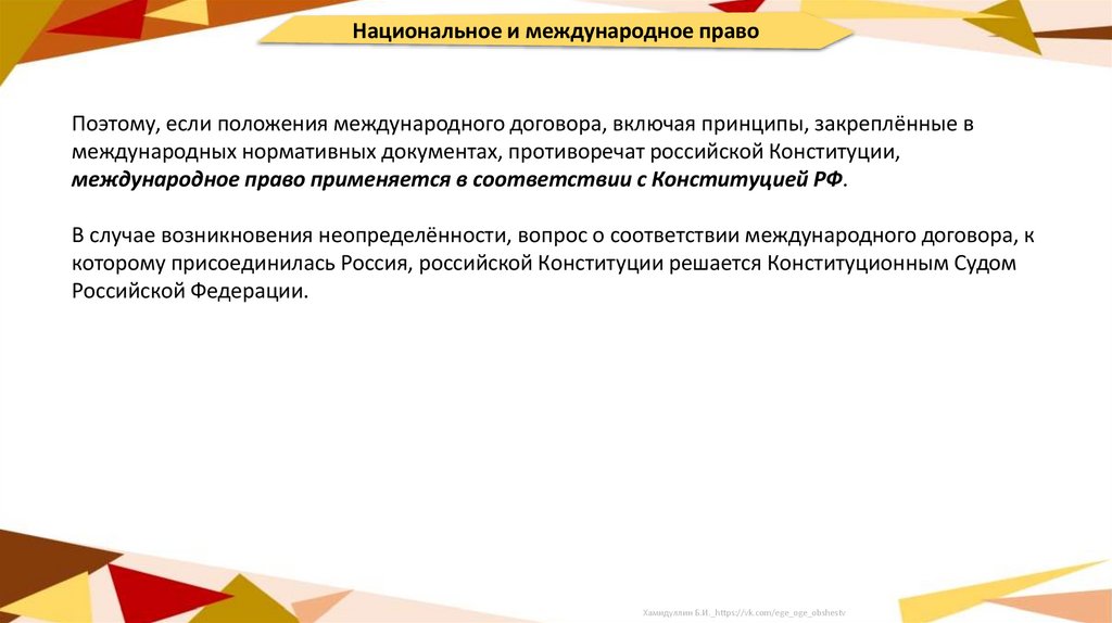 Национальное и международное правоПоэтому, если положения международного договора, включая принципы, закреплённые в