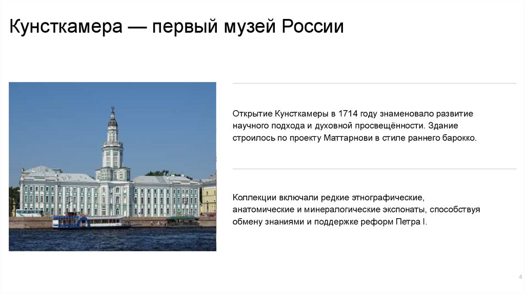 Кунсткамера — первый музей РоссииОткрытие Кунсткамеры в 1714 году знаменовало развитие