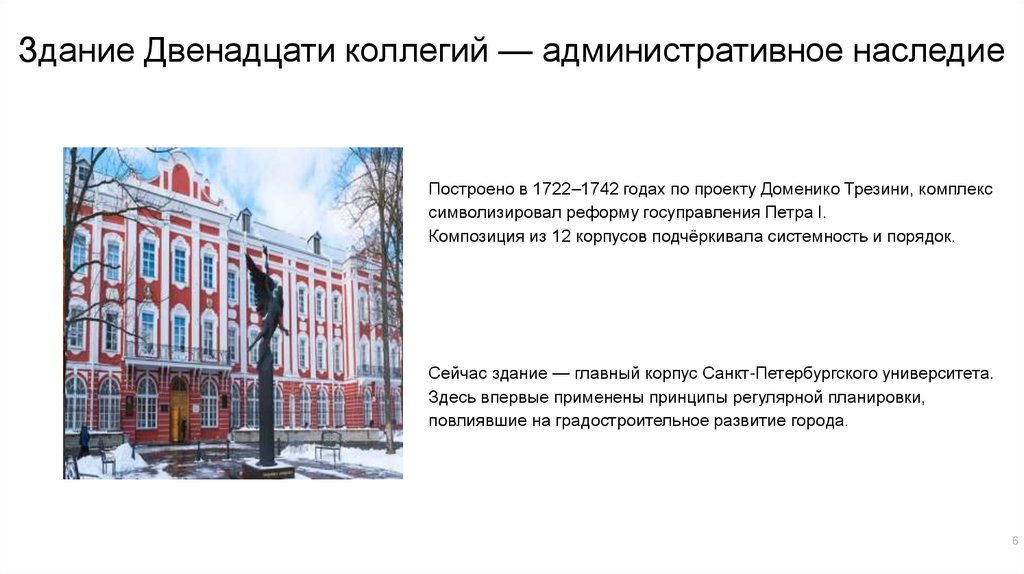 Здание Двенадцати коллегий — административное наследиеПостроено в 1722–1742 годах по проекту Доменико Трезини, комплекс