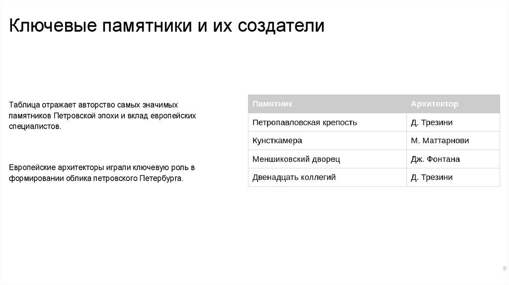 Ключевые памятники и их создателиТаблица отражает авторство самых значимых
