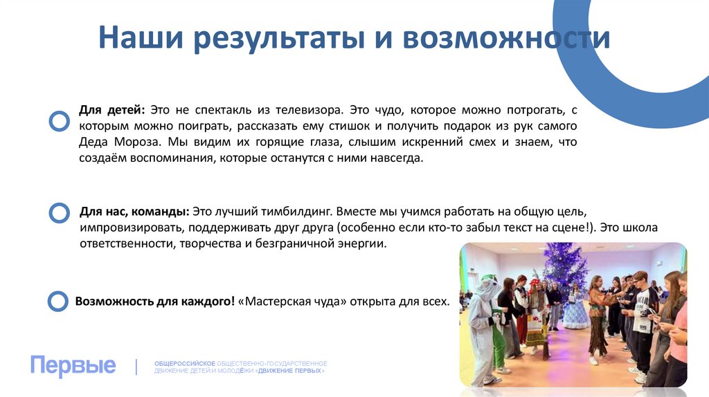 Наши результаты и возможностиДля детей: Это не спектакль из телевизора. Это чудо, которое можно потрогать, с