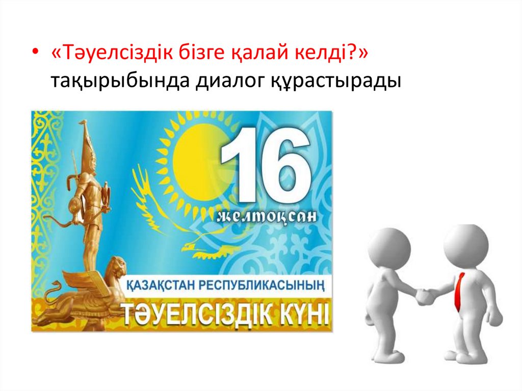 • «Тәуелсіздік бізге қалай келді?»тақырыбында диалог құрастырады