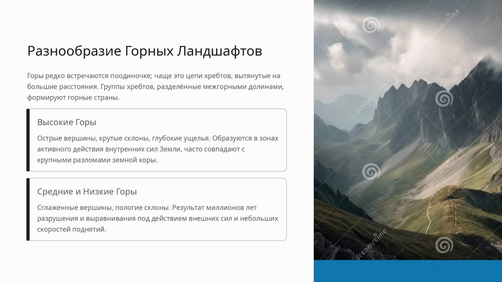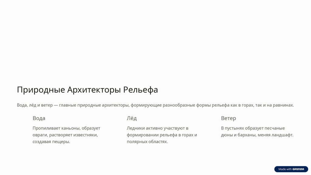 Природные Архитекторы РельефаВода, лёд и ветер — главные природные архитекторы, формирующие разнообразные формы рельефа как в горах, так и на равнинах.