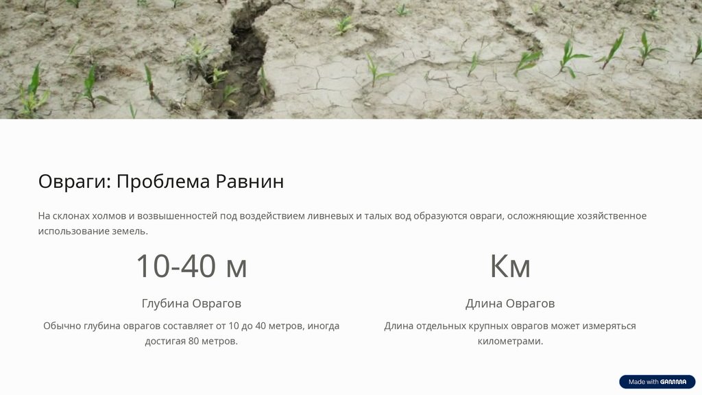Овраги: Проблема РавнинНа склонах холмов и возвышенностей под воздействием ливневых и талых вод образуются овраги, осложняющие хозяйственное