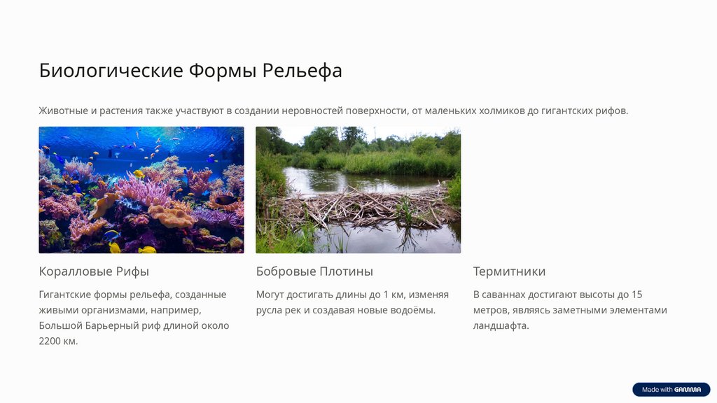 Биологические Формы РельефаЖивотные и растения также участвуют в создании неровностей поверхности, от маленьких холмиков до гигантских рифов.