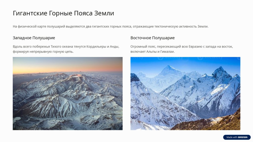 Гигантские Горные Пояса ЗемлиНа физической карте полушарий выделяются два гигантских горных пояса, отражающие тектоническую активность Земли.