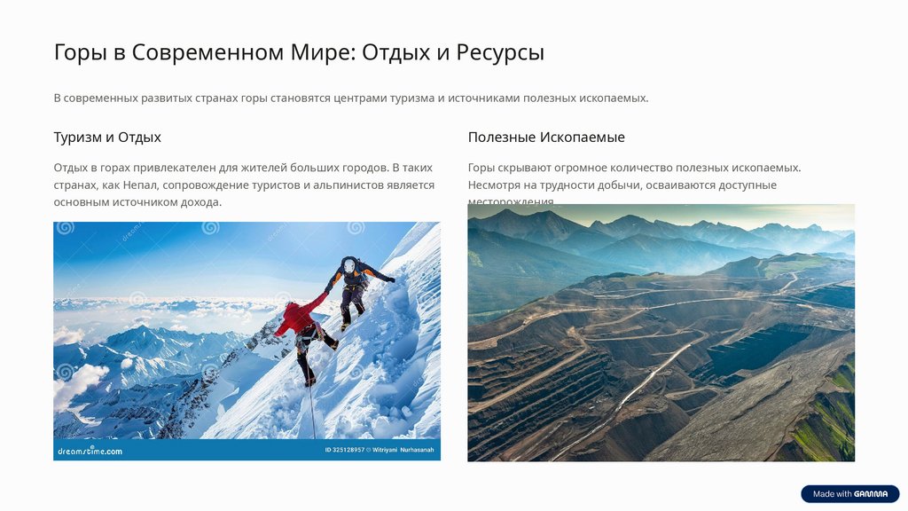 Горы в Современном Мире: Отдых и РесурсыВ современных развитых странах горы становятся центрами туризма и источниками полезных ископаемых.
