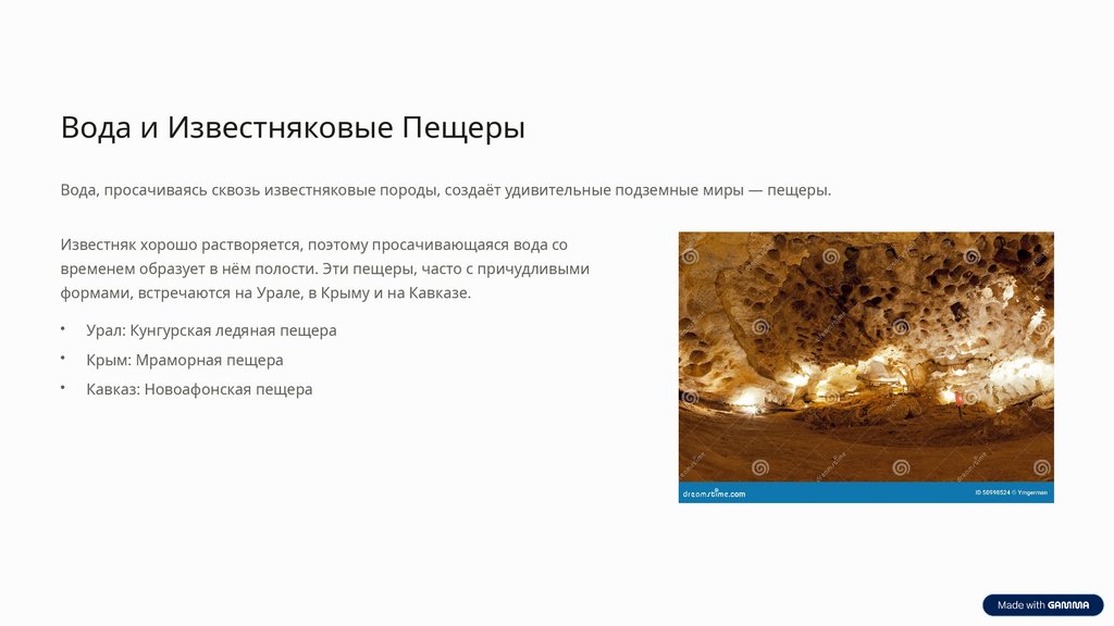 Вода и Известняковые ПещерыВода, просачиваясь сквозь известняковые породы, создаёт удивительные подземные миры — пещеры.