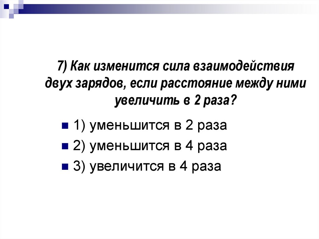7) Как изменится сила взаимодействиядвух зарядов, если расстояние между ними