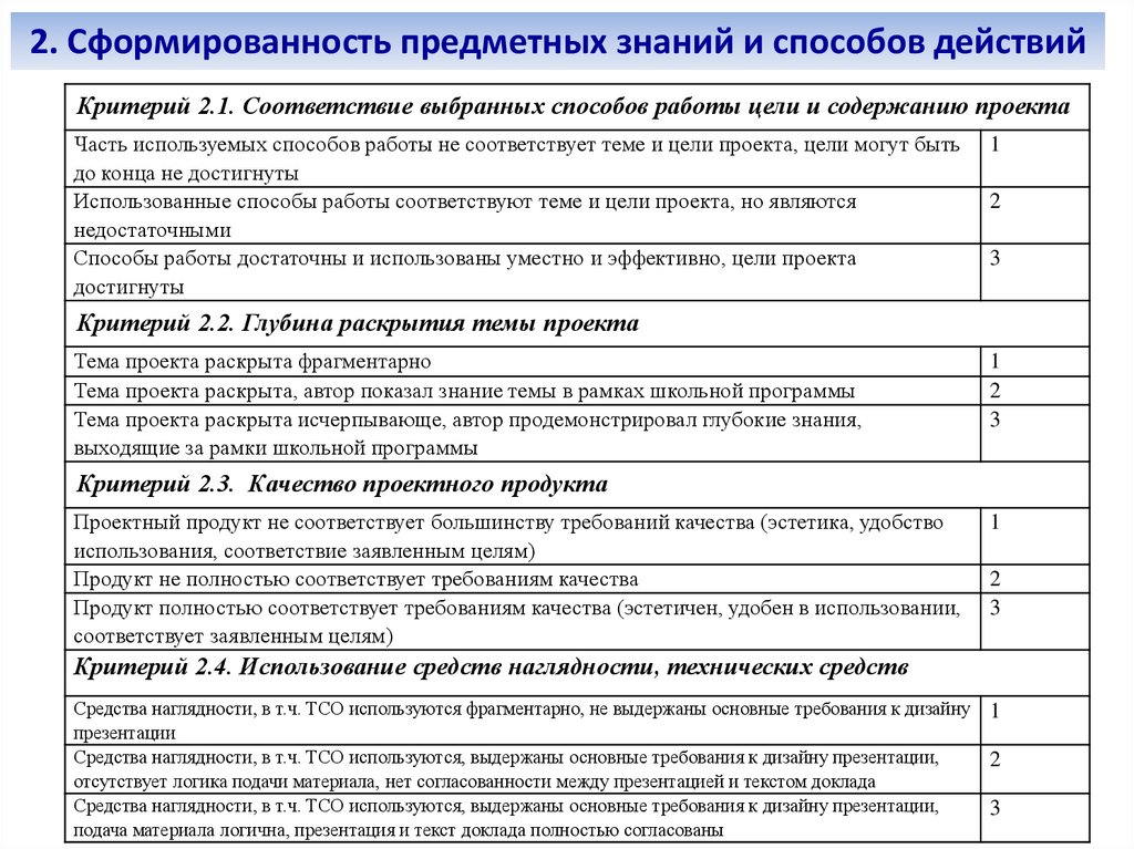 2. Сформированность предметных знаний и способов действийКритерий 2.1. Соответствие выбранных способов работы цели и содержанию проекта