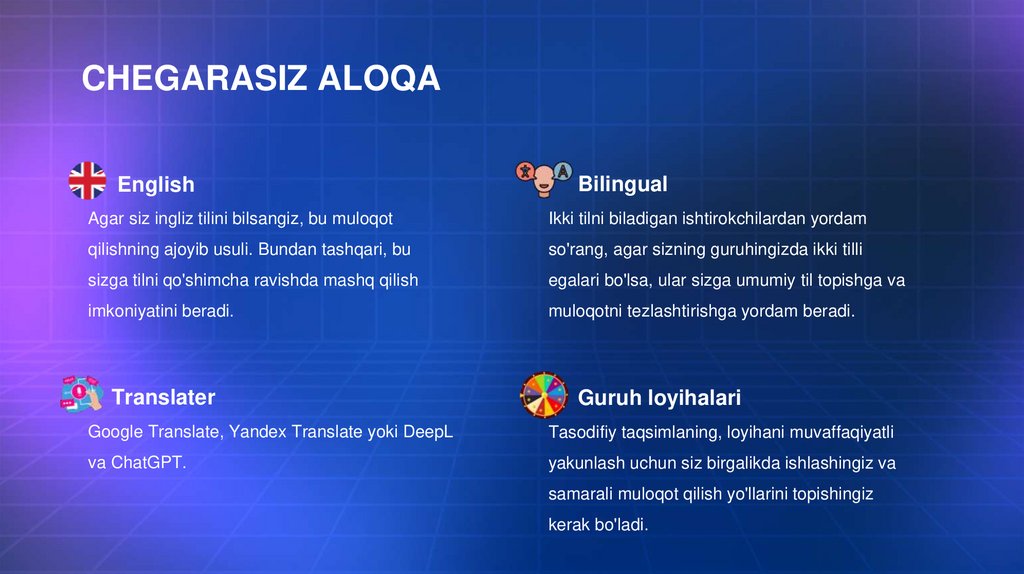 CHEGARASIZ ALOQAEnglish