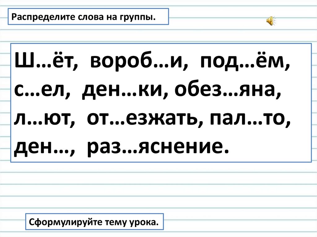 Распределите слова на группы.Ш…ёт, вороб…и, под…ём,