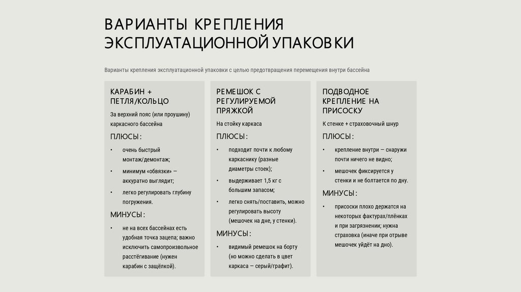Варианты крепления эксплуатационной упаковки с целью предотвращения перемещения внутри бассейна