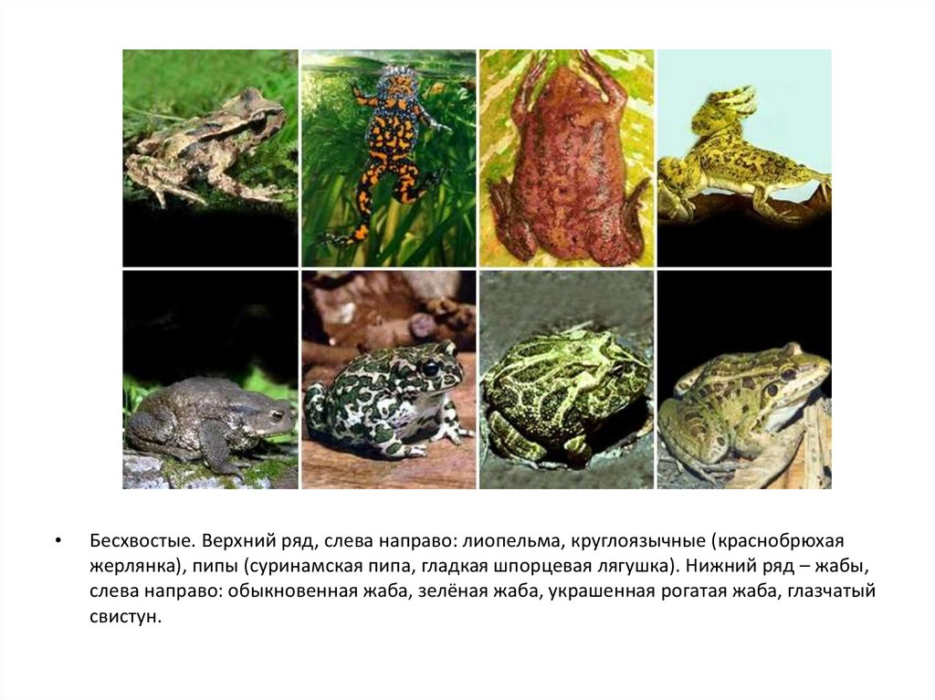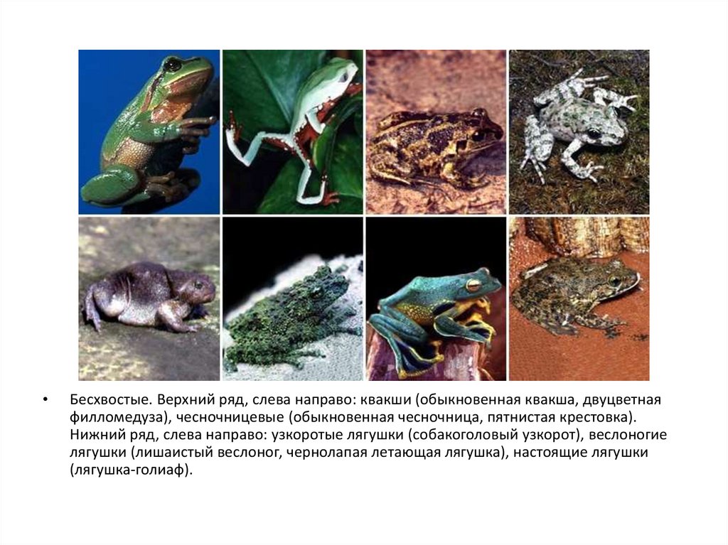 бесхвостые. Эти животные имеют короткое широкое тело и две пары сильных