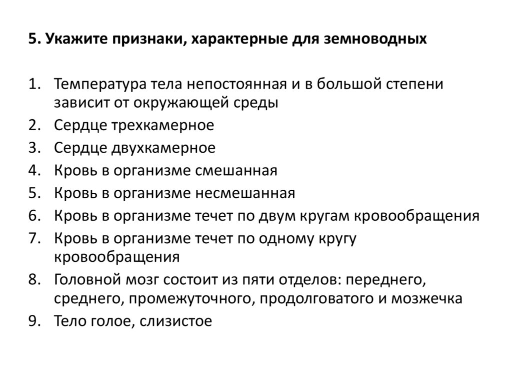 5. Укажите признаки, характерные для земноводных1. Температура тела непостоянная и в большой степени