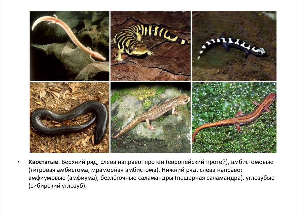 Хвостатые. Верхний ряд, слева направо: протеи (европейский протей), амбистомовые