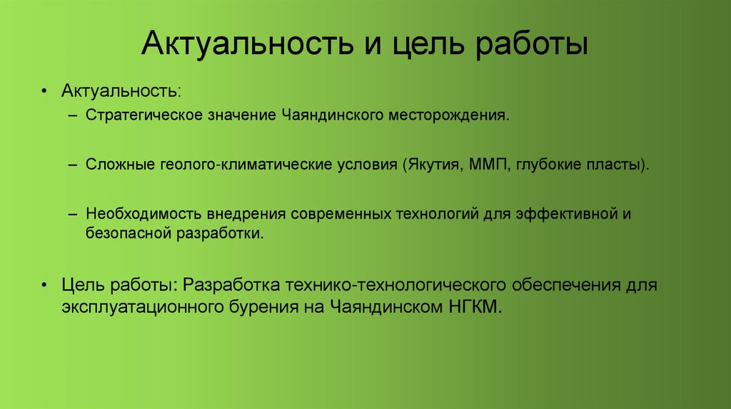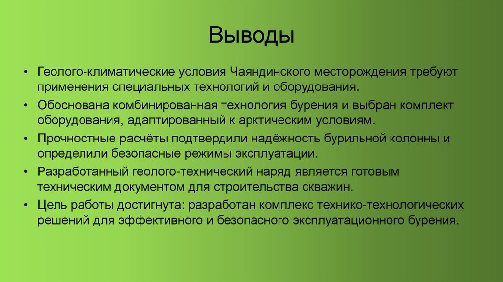 Выводы• Геолого-климатические условия Чаяндинского месторождения требуют
