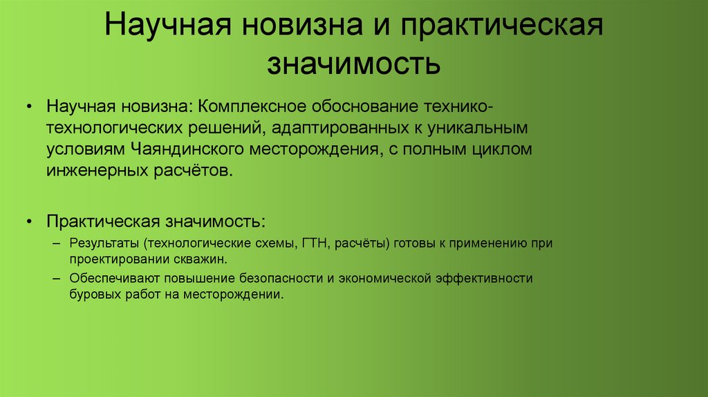 • Научная новизна: Комплексное обоснование техникотехнологических решений, адаптированных к уникальным