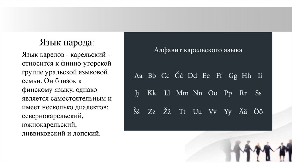 Язык народа:Язык карелов - карельский относится к финно-угорской