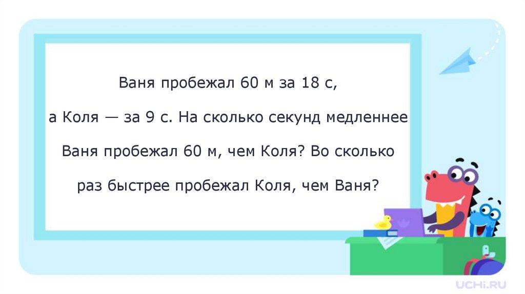 Ваня пробежал 60 м за 18 с,а Коля — за 9 с. На сколько секунд медленнее