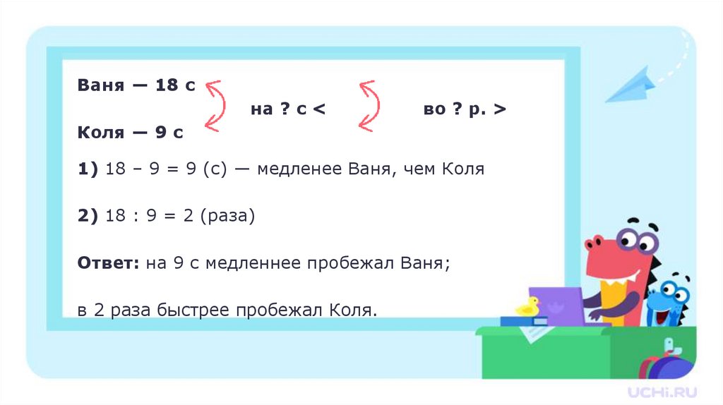 1) 18 – 9 = 9 (с) — медленее Ваня, чем Коля