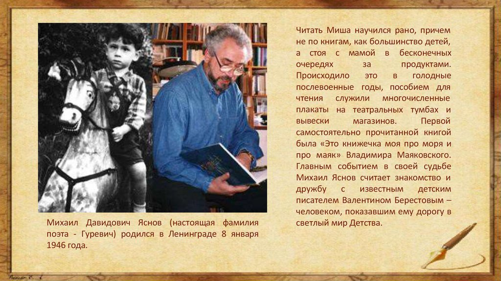 Михаил Давидович Яснов (настоящая фамилияпоэта - Гуревич) родился в Ленинграде 8 января