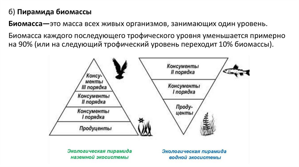 б) Пирамида биомассыБиомасса—это масса всех живых организмов, занимающих один уровень.