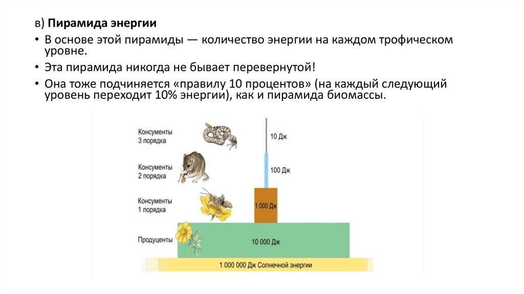 в) Пирамида энергии• В основе этой пирамиды — количество энергии на каждом трофическом