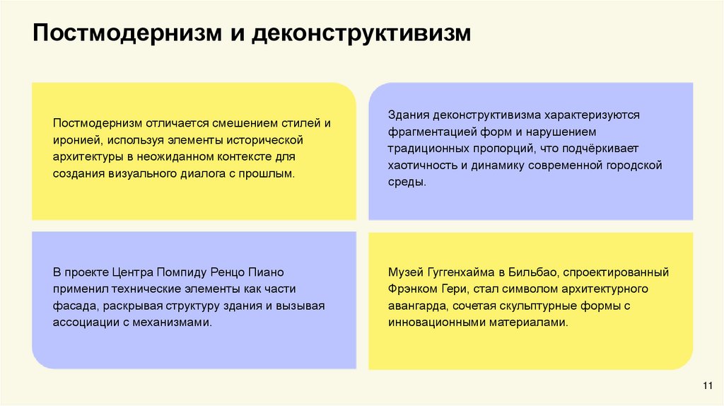 Постмодернизм и деконструктивизмПостмодернизм отличается смешением стилей и