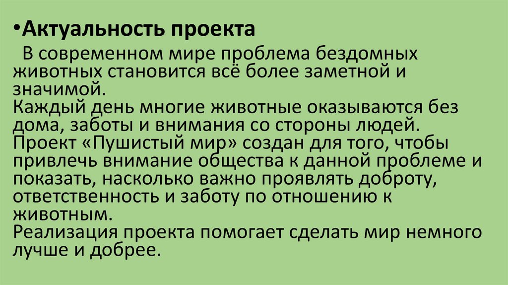 • Подводя итог, можно сказать, что проект«Пушистый мир» является актуальным и