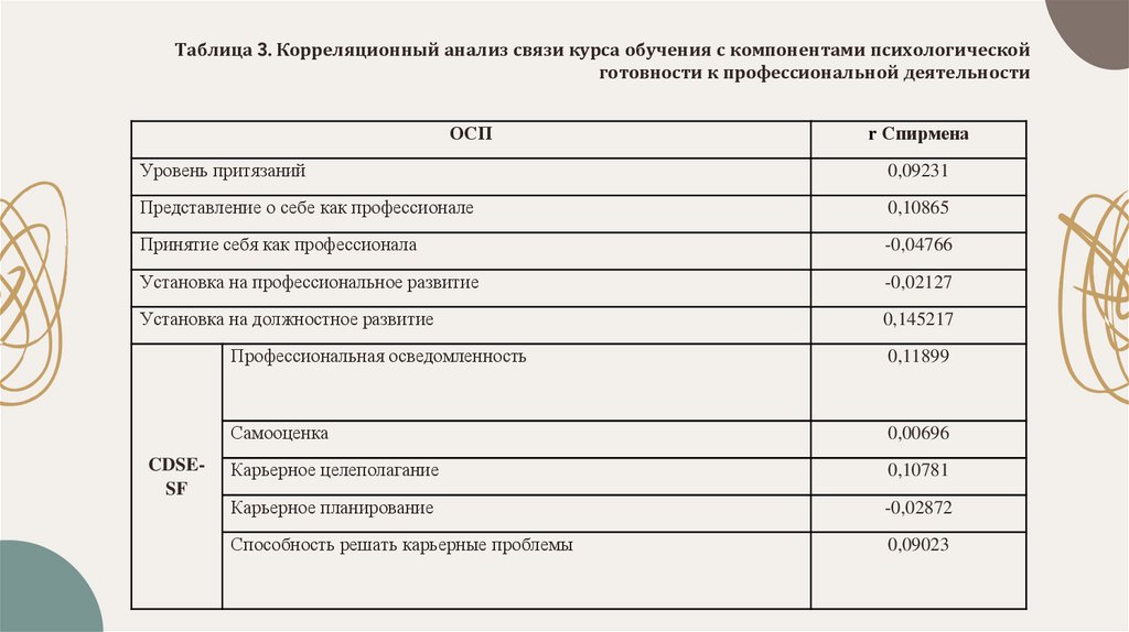 Таблица 3. Корреляционный анализ связи курса обучения с компонентами психологическойготовности к профессиональной деятельности