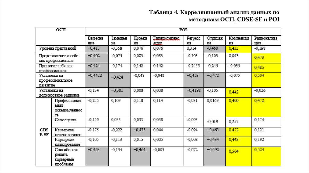 Таблица 4. Корреляционный анализ данных пометодикам ОСП, CDSE-SF и POI