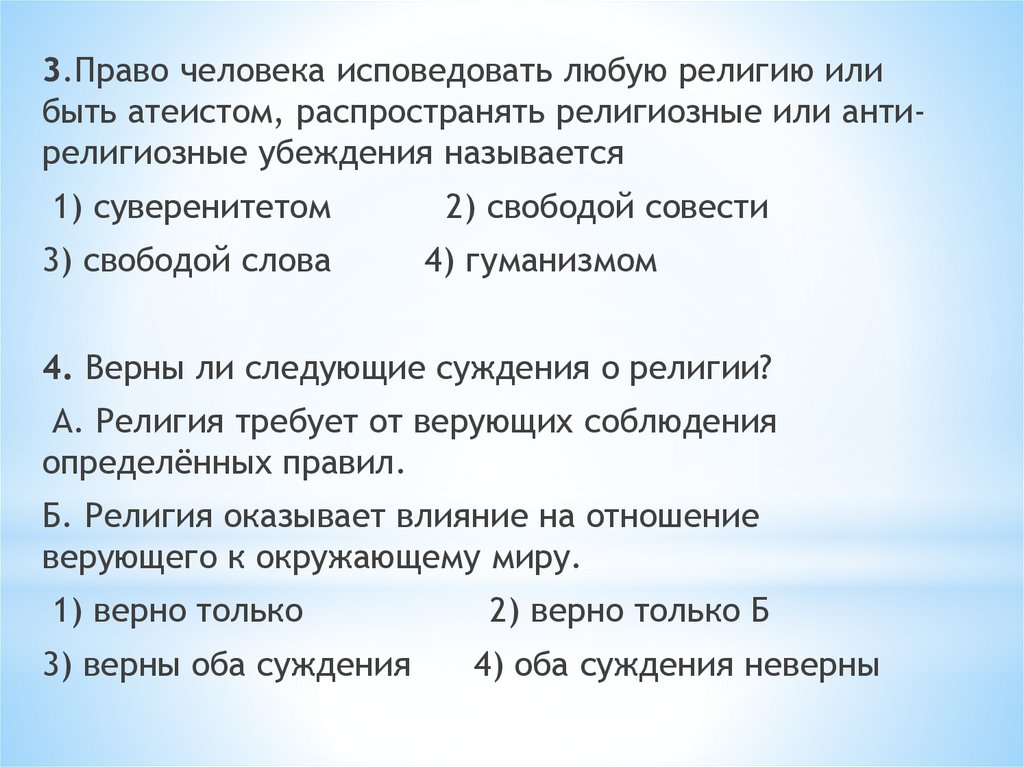 3.Право человека исповедовать любую религию илибыть атеистом, распространять религиозные или антирелигиозные убеждения называется