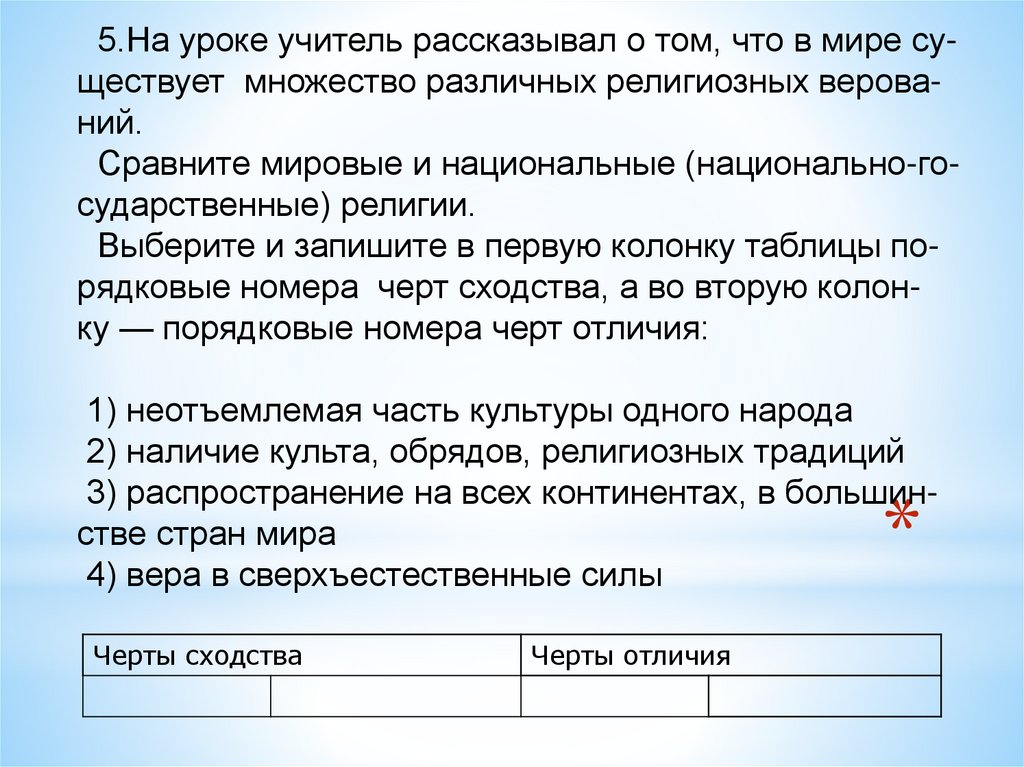 5.На уроке учитель рассказывал о том, что в мире существует множество различных религиозных верований.Сравните мировые и национальные (национально-государственные) религии.