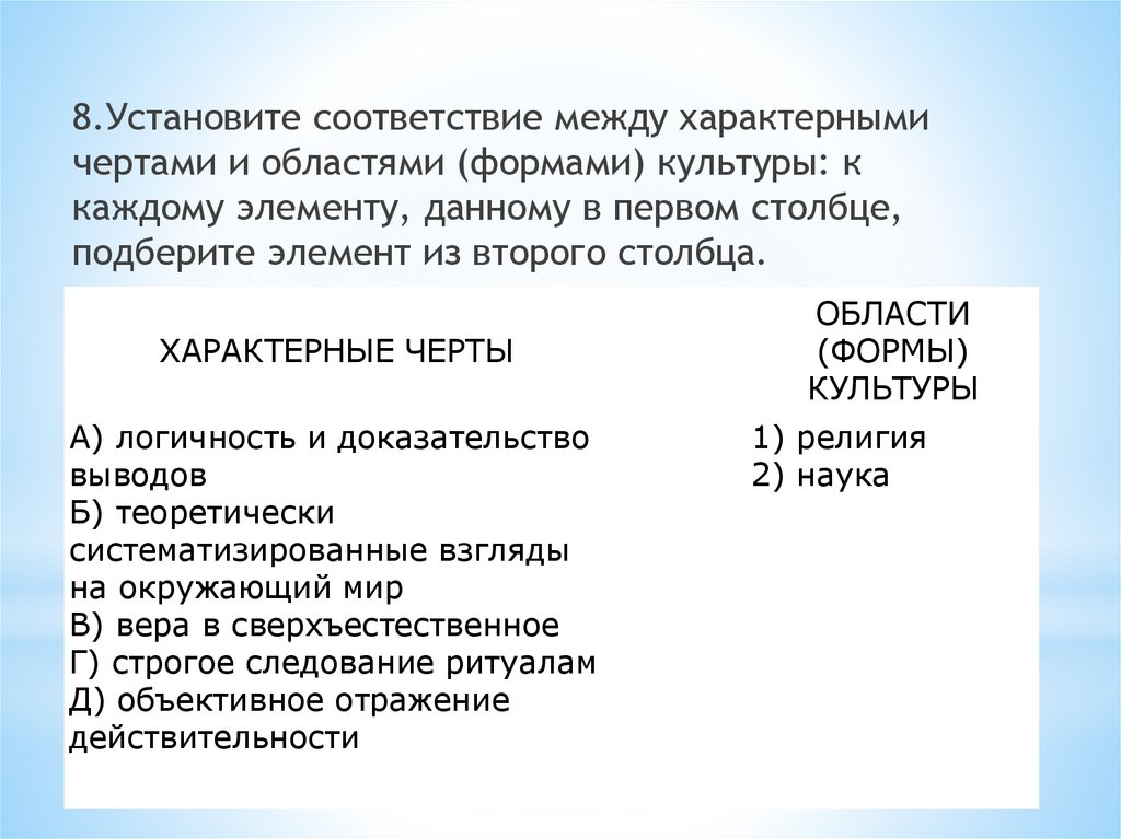 8.Установите соответствие между характернымичертами и областями (формами) культуры: к
